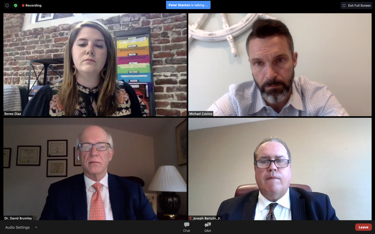 Panelists discussed the ins and outs of reopening on WBJ’s webcast “Back to Business” on Wednesday: Joseph Bartulis, chair of the labor and employment law practice group at Worcester Fletcher Tilton PC, Dr. David Brumley, vice president of medical affairs at Worcester insurer Fallon Health, Renee Diaz, owner of Worcester bakery The Queen’s Cups, and Michael Covino, president of Worcester restaurant parent company Niche Hospitality Group.