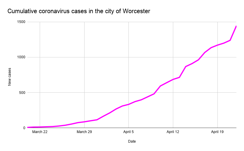 The City of Worcester reported 1,445Â total cases Wednesday, up 206, or 17%, in one day. That’s by far the city’s largest single-day increase. For comparison, Worcester County had roughly as many cases on April 9.