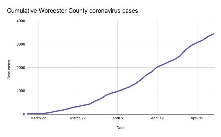 The new cases brought Worcester County to a total of 3,456, an increase in one day of 3%. Statewide, cases rose by 1,745 cases, or 4%, to 42,944.