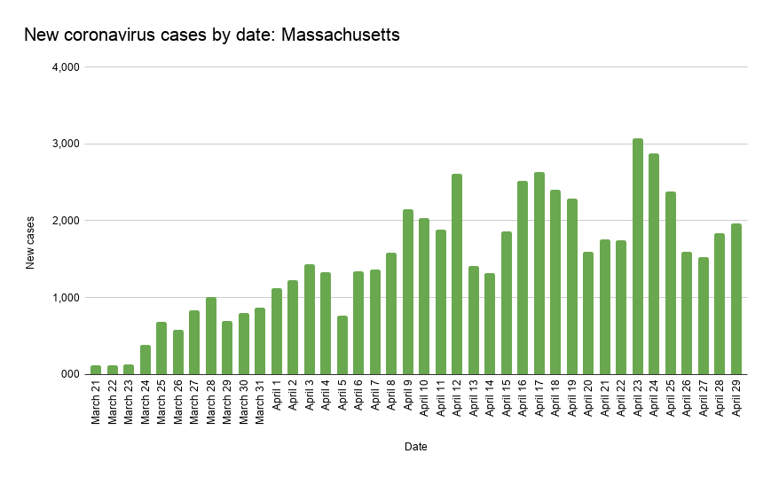 UMass Memorial Health Care and Saint Vincent Hospital in Worcester report 269 cases with 104 in the ICU. The hospitals had seven new deaths, bringing their death toll to date up to 102. It is reported two new employees have tested positive bringing the tally to 162.