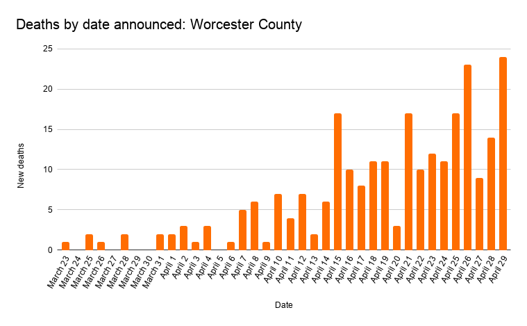The 24 new deaths bring Worcester County’s total to 253. The Massachusetts coronavirus related death toll increased by 252 to 3,405.