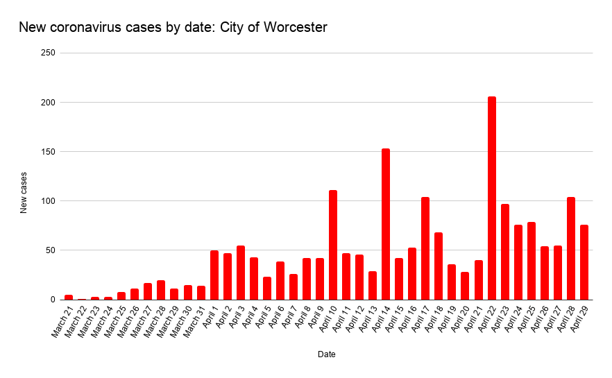 The City of Worcester reported 1,986 cases Wednesday. This is a 4% increase from Tuesday with 76 new cases.