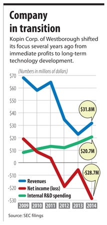 Kopin is betting that the market will develop. It’s been in the red since 2012, while spending more on R&D. Nixdorff said you might say that, despite its long history, it has “switched into startup mode,” making bold investments into technological building blocks for a product that hasn’t yet developed a market.