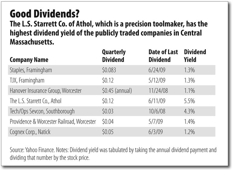 Dividends are measured by the value of the payment per share as a percentage of the stock price. A hefty dividend yield is around 3 or 4 percent, according to Grenon. The dividends issued by Central Massachusetts stock companies tend to be much smaller, in the 1 to 2 percent range. The exceptions are The L.S. Starrett Co. in Athol, which has a dividend yield of 5.5 percent, according to Yahoo Finance, and Tech/Ops Sevcon of Southborough, which had a dividend yield of 4.3 percent. But Tech/Ops’ last dividend payment was in October 2008.