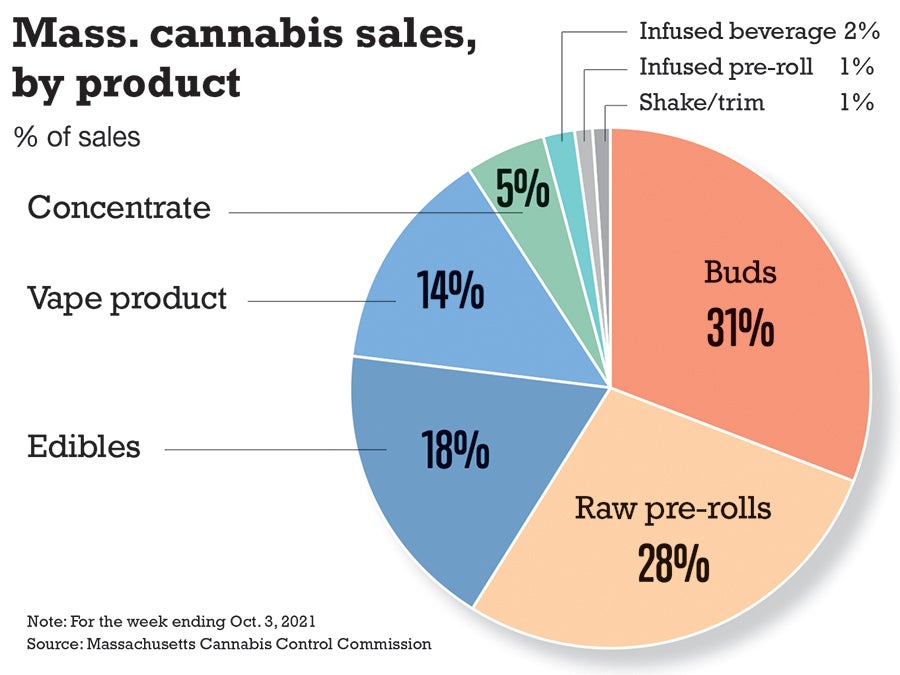 Cannabis flower and its more convenient cousin, the pre-roll, dominate Massachusetts sales, according to CCC, which tracks sale information. Collectively, they comprised 58% of sales in the week ending Oct. 10. In second were edibles at 19% and vape products at 14%.