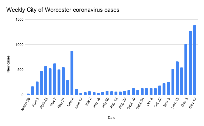 The city reported 1,390 new cases in the past week, bringing Worcester’s total so far throughout the pandemic to 12,785.