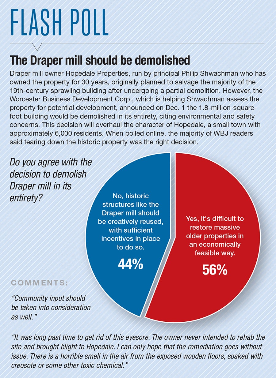 The announcement has triggered mixed reactions from local residents and others invested in the social, historical and economic wellbeing of both Hopedale and the Blackstone Valley. Hebert, who said she was sad the structure was coming down in full, said she hoped the Draper legacy would be commemorated, such as with a brick courtyard built from the mill’s remains.