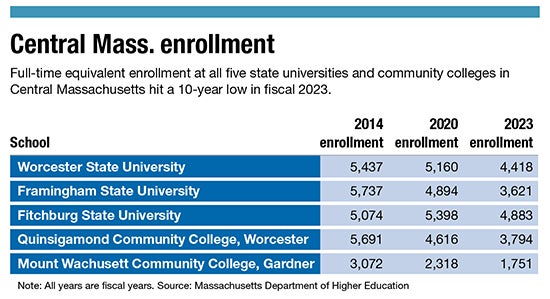 Enrollment has hit a 10-year low at all five of the state universities and community colleges in Central Massachusetts, with a considerable drop between fiscal 2020 and fiscal 2023.