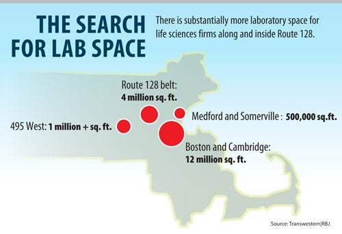 The Route 128 belt has nearly 4 million square feet, while Medford and Somerville have nearly 500,000 square feet combined. The 495-West market, which includes Natick and Framingham and the Greater MetroWest region, has just over 1 million square feet of laboratory space, with about 12 percent of it vacant.