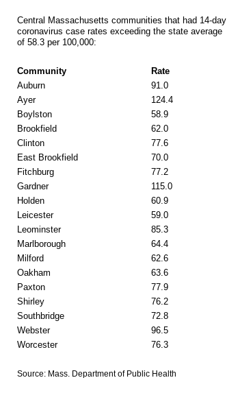 Among Central Massachusetts cities and towns, 19 are above state average in the new case rate in the past two weeks. That average fell slightly to 58.3 per 100,000 on Thursday.