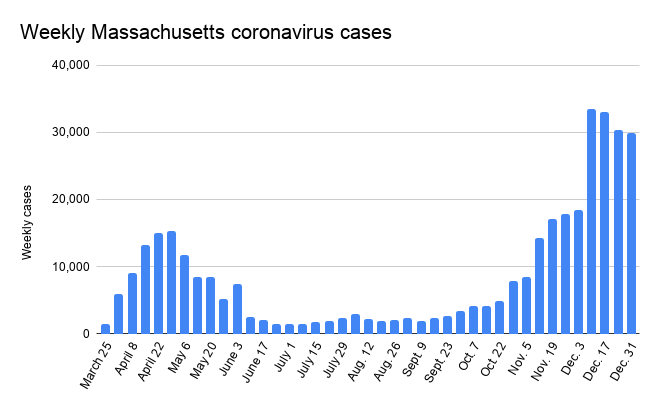 Cases in Central Massachusetts and across the state have taken a minor dip from record highs earlier in December, but there are signs that a post-Christmas bump in cases may be starting, as public health officials had warned.