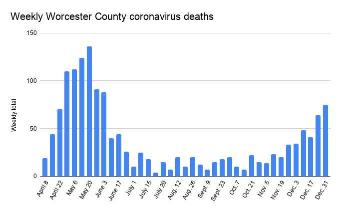 As for deaths, Worcester County had a reported 75 new deaths, its highest weekly total since the spring, to hit 1,448. Across Massachusetts, 451 new deaths brings the statewide total to 12,157.
