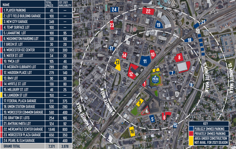 According to the announcement, there are at least 24 parking lots and garages expected to account for a total of 7,302 available spaces. Half of those parking areas are owned by the City of Worcester and will be priced at $5, $10 or $15, depending on how close they are to Polar Park. Private lots will set their own pricing.
