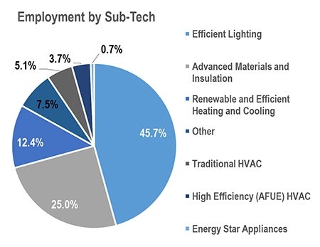 Overall, Massachusetts ranks fourth in the nation for energy efficiency jobs, with 89 percent of those jobs focused on efficiency services. Installation firms make up 43 percent of the activity, followed by trade with 26 percent.