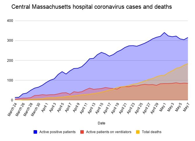Positive coronavirus cases in Central Massachusetts hospitals stood at 253 as of May 20, according to UMass Memorial Health Care. That was the exact same number as a month prior, and down 26% from a peak on May 1.