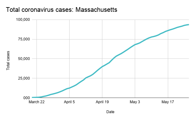 Massachusetts, on the other hand, has seen a sharper decline in daily seven-day coronavirus case averages. On May 1 there was an average of 1,906 new cases in the state, but the rate steadily decreased to 888 on May 25, which is the lowest average since the beginning of April.Â