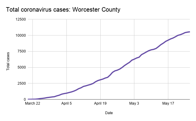 Across Worcester County, coronavirus cases throughout May have been largely flat following dramatic increases during April.