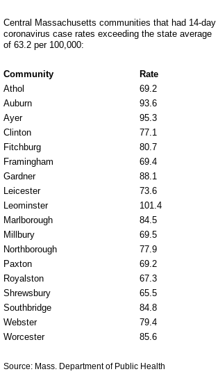Deaths, which typically lag cases by a few weeks, continue rising. In Worcester County, deaths have risen in the past week by 64, the highest since late May and early June, to hit 1,448. Across Massachusetts, confirmed deaths have risen by 401 to hit 11,706.