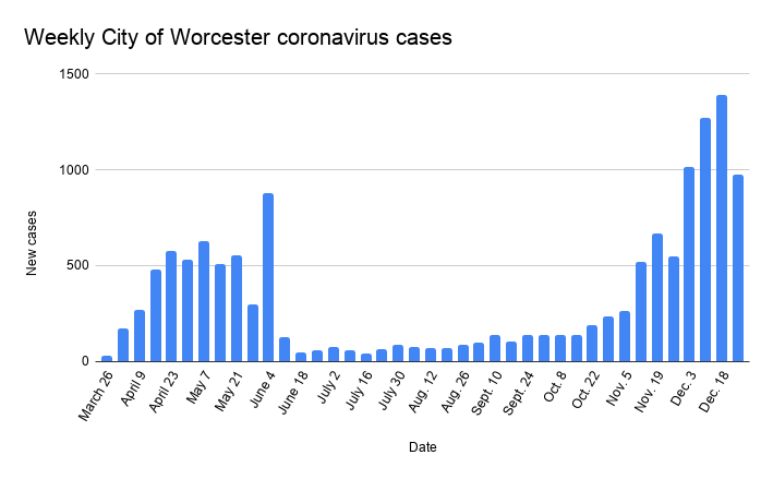 Worcester city officials reported earlier Thursday that cases in the city have also dipped slightly in the past week, with 977 new cases bringing the city’s total to 13,762.