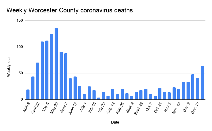 New coronavirus cases dipped this week in Worcester County, but the relative good news was tempered by the highest weekly death count since late spring.
