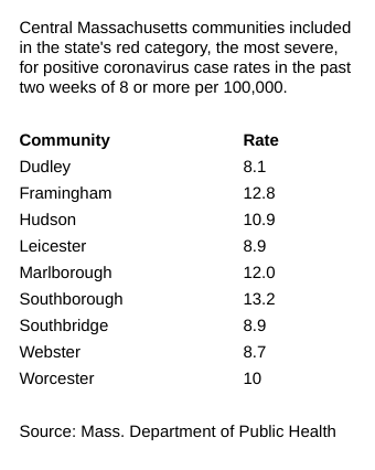 In Central Massachusetts, more communities are being placed in the state Department of Public Health’s red category, for the highest rates of cases. Nine cities and towns are now in that category: Dudley, Framingham, Hudson, Leicester, Marlborough, Southborough, Southbridge, Webster and Worcester.