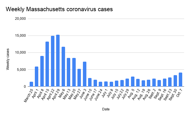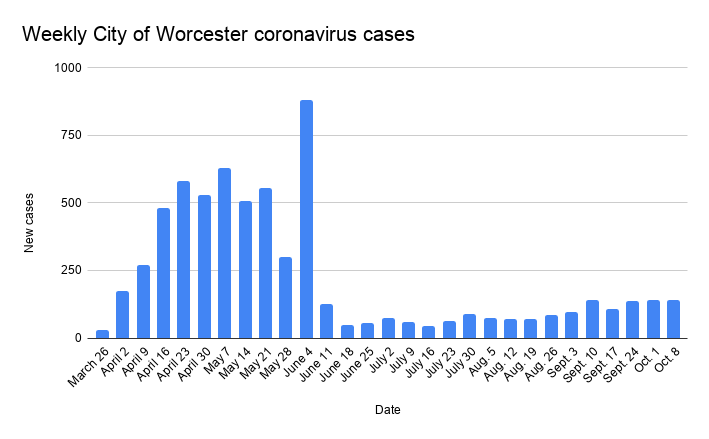 In both Worcester County and across Massachusetts, cases in the week ending Wednesday were the highest since early June. That late-spring time period has been a measuring stick for weeks as both county and statewide totals continue to tick up steadily since hitting lows over the summer.