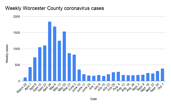 Worcester County now has 14,864 total cases through Wednesday, up 389 from the previous week. That’s the highest since 818 were reported in the week ending June 3.