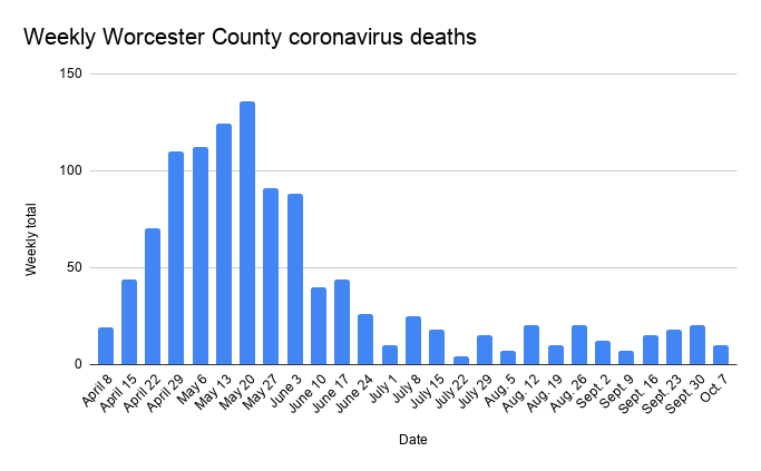 Deaths in Worcester County rose by 10 in the past week to 1,125 since the pandemic began. Statewide deaths rose by 100 in the past week to 9,342.
