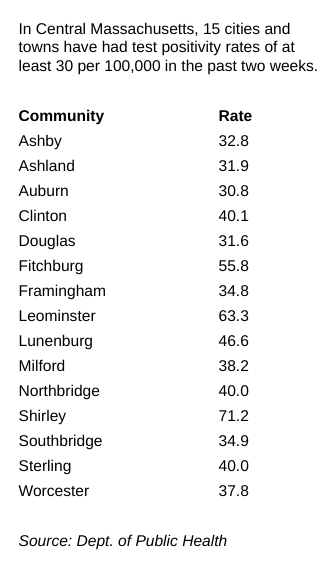 Positivity rates among tests in Worcester are at about 15%, up by about half in the past week, according to Dr. Michael Hirsh, the city’s medical director.