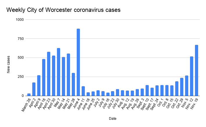 The City of Worcester has also seen an all-time high in the past week, with 667 cases in the past week, according to the city. That total comes with a caveat: weekly totals during the spring peak of the pandemic didn’t include what ended up being a backlog of cases reported later.