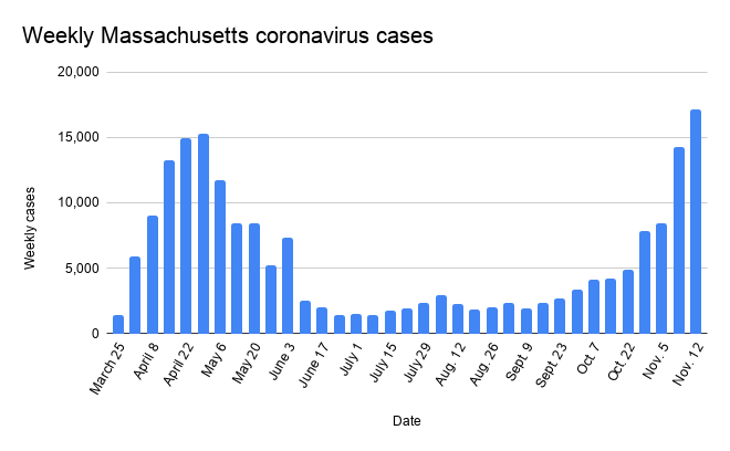 In the last seven days, Worcester County and the state of Massachusetts have recorded their highest weekly totals of coronavirus cases, indicating how quickly the pandemic has returned after a summer lull.