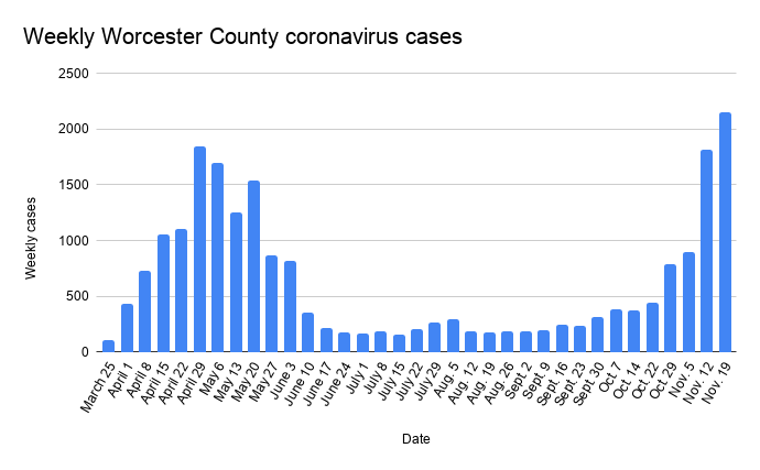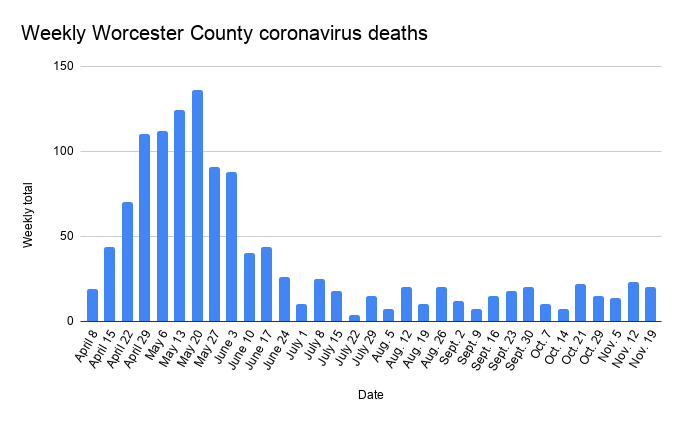 Deaths in Worcester County rose in the past week by 20 to 1,228. Deaths across the state rose by 193 to 10,435.