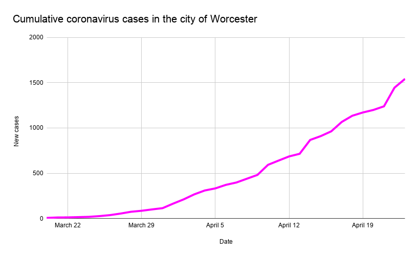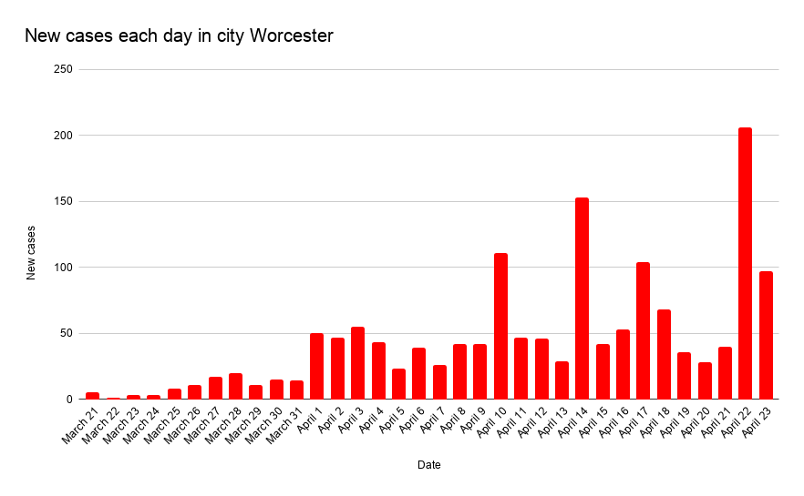 Within the City of Worcester, it is reported there are now 1,542 total cases Thursday, up 97, or 7%. This is a smaller increase than Wednesday’s large 17% rise in cases within Worcester.