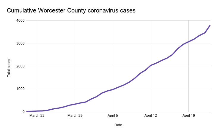 Cases within Worcester County had a large uptake in coronavirus cases with 342 new cases Thursday. The total number of cases in Worcester County is now 3,798, according to Massachusetts Department of Public Health data.Â