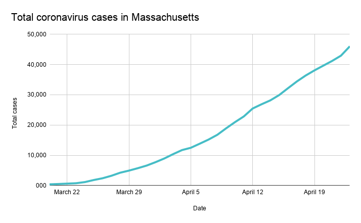 Cases within Worcester County rose by 10% in one day, while cases statewide rose by 3,079, or 7% bringing the Massachusetts total to 46,023.