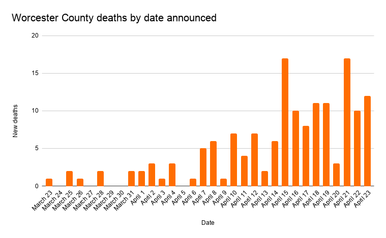 Worcester County had 12 new reported deaths, bringing the total so far to 155.