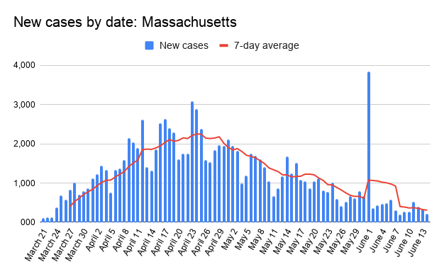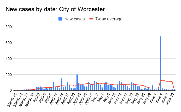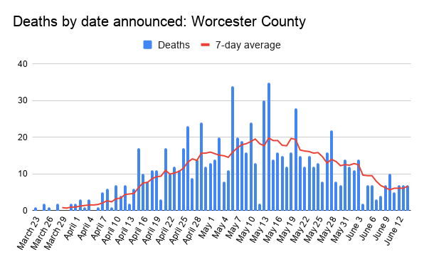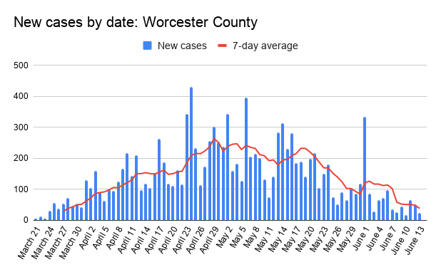 Sunday recorded 14 new cases in Worcester County, the lowest since March 23. The new cases increase the total to 11,975. New fatalities over the weekend in Worcester County add to the total death toll of 870.