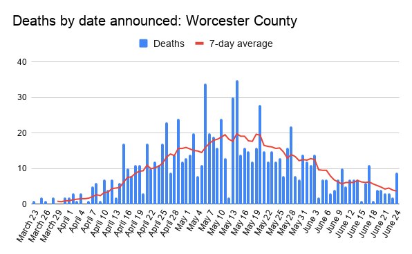 The nine new fatalities within Worcester County added to the total tally of 914 deaths. Statewide, there were 48 newly confirmed and probable fatalities with 7,938 overall.