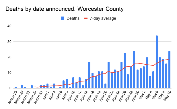 Another 40 coronavirus deaths in Worcester County were reported over the weekend, bringing the county’s total to 444.