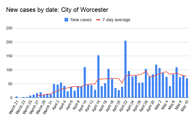 In the city of Worcester, 151 new cases were reported over the weekend, bringing the city’s total to 2,924. A month ago, the city had 582 cases.