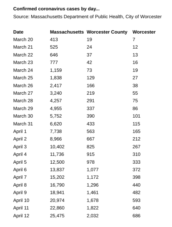The city of Worcester has reported 686 cases as of Sunday, including 46 new cases. Saint Vincent Hospital and UMass Memorial Health Care in Worcester have a reported 184 combined inpatient cases, including 62 in intensive care. Those two hospital networks have reported a total of 27 coronavirus-related deaths and 97 cases of their own employees testing positive.