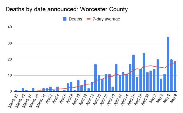 Friday’s 19 deaths follow this week’s high daily death increase with 34 on Wednesday, and 20 on Thursday. In total, Worcester County has had 404 coronavirus-related deaths. Statewide, the death toll increased by 150 bringing the total to 4,704.