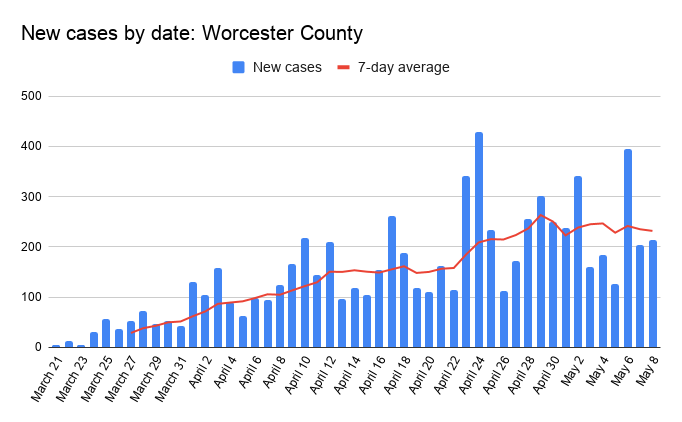 The 214 new cases in Worcester County is a 3% rise from Thursday, and the case total is now 7,410. Across Massachusetts there was a 2% rise of 1,612 cases, adding to the total of 75,333.Â