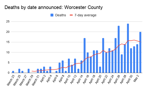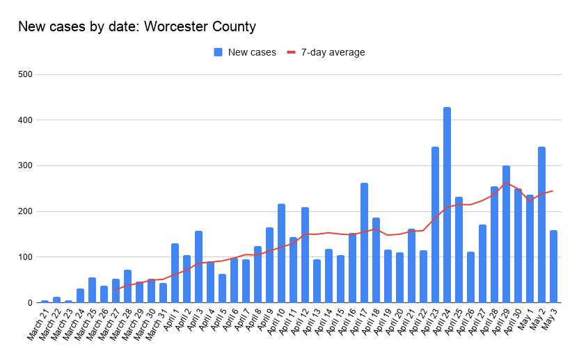Worcester County had a reported 34 new coronavirus deaths over the weekend, bringing the total so far to 312.