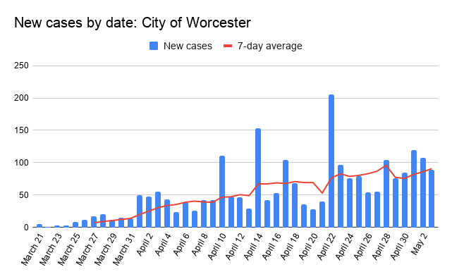 Cases reached 2,386 in the city of Worcester Sunday, with increases of 107 Saturday and 89 Sunday.Â