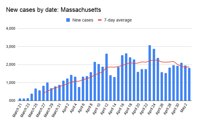 Total cases, according to the Massachusetts Department of Public Health, reached 6,288 in Worcester County on Sunday and 68,087 statewide. Those one-day increases were each up 3%.