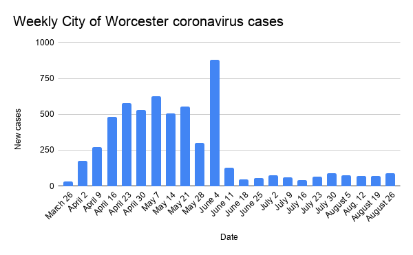 The City of Worcester reported 5,803 total coronavirus cases reported since the beginning of the pandemic as of Thursday. This is an increase of 87 new cases since the prior week, the highest weekly number in the past month.