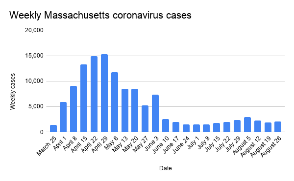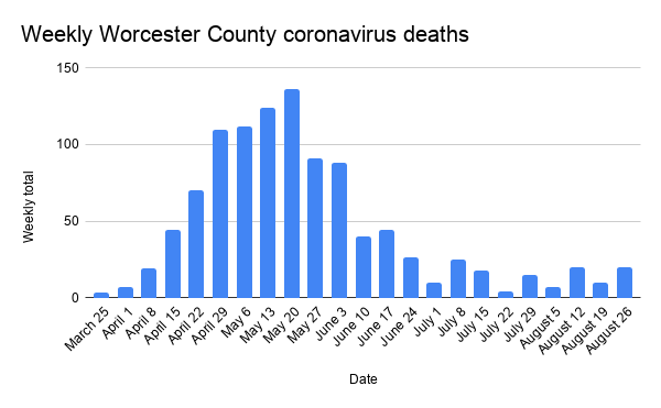 The county had 185 new coronavirus cases, and an estimated 20Â deaths in the most recent week, according to the Massachusetts Department of Public Health. This compares to last week ending Aug. 19, which had 180 new cases and 10 fatalities.