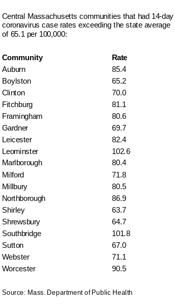 The state’s 14-day rate of new cases, a key metric used by the DPH, continues to climb. It stood at 65.1 per 100,000 on Thursday, a rise from 50 a week prior. In Central Massachusetts, 18Â cities and towns exceed the state average.