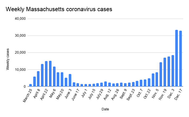 Across Massachusetts, cases in the past week nearly reached the record set just a week prior, with nearly 33,000 new cases. The state now has 292,316 total cases since March.